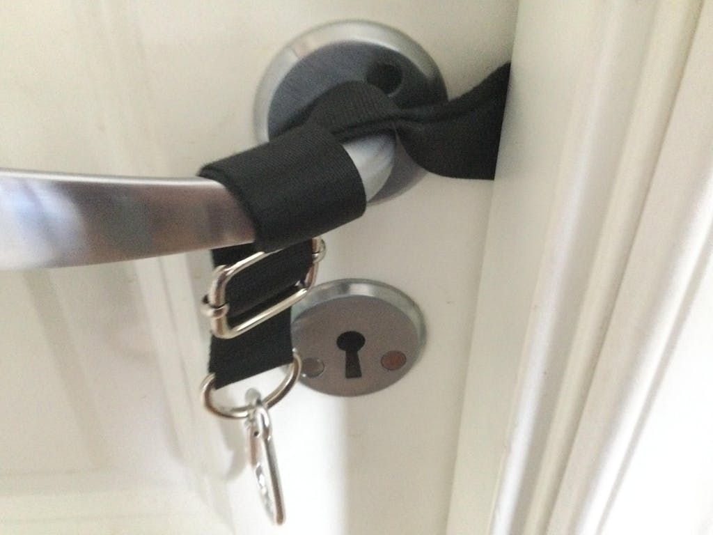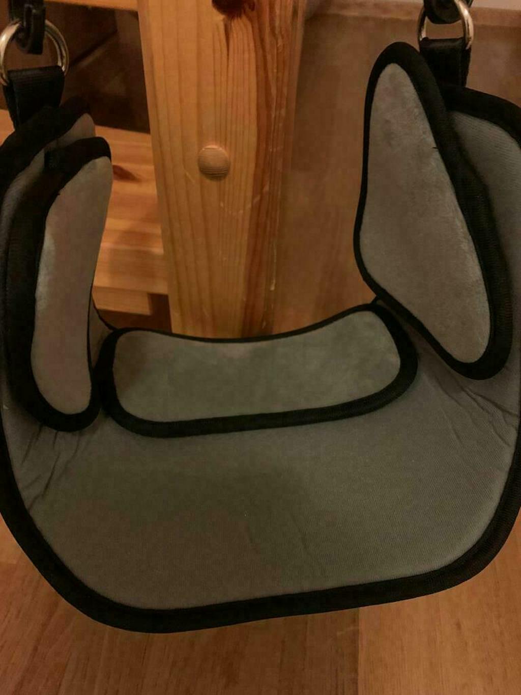 Nakkekøyen er kjempeenkel å sette opp og kan brukes omtrent overalt. Alt du trenger å gjøre er å feste den i et dørhåndtak eller rekkverk, og deretter justere høyden!